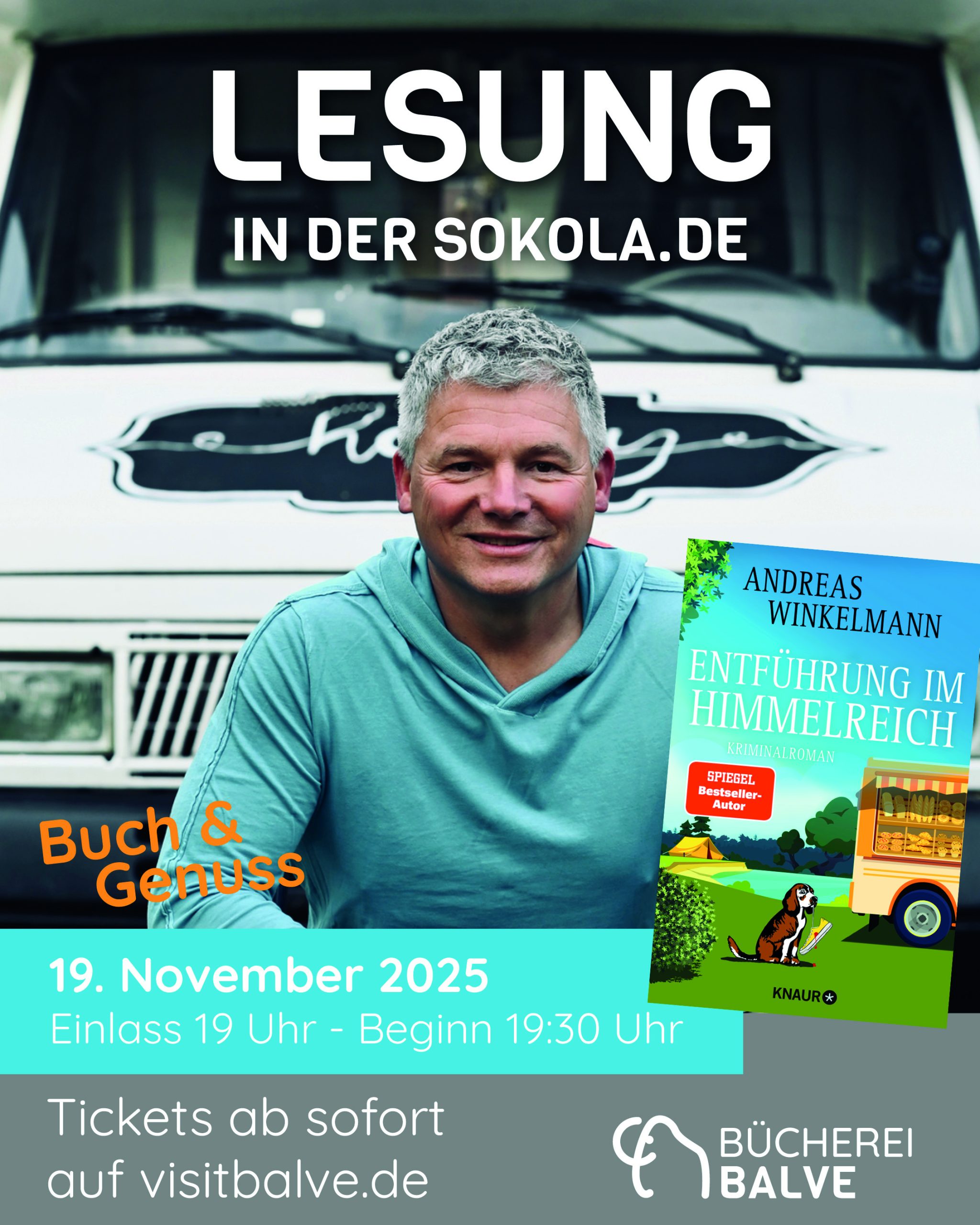 Einer der bekanntesten Thriller-Autoren Deutschlands ist bereits zum zweiten Mal Gast der Bücherei Balve. Dieses Mal ist die Location etwas wärmer und gemütlicher: Ort der Lesung ist unsere SoKoLa.de. Der Einlass beginnt um 19:00 Uhr, Beginn der Lesung ist 19:30 Uhr. Neben dem bereits erwähnten Finger-Food gibt es aber auch Bücher zu kaufen, diese werden vom Bücher-Eck aus Sundern angeboten.